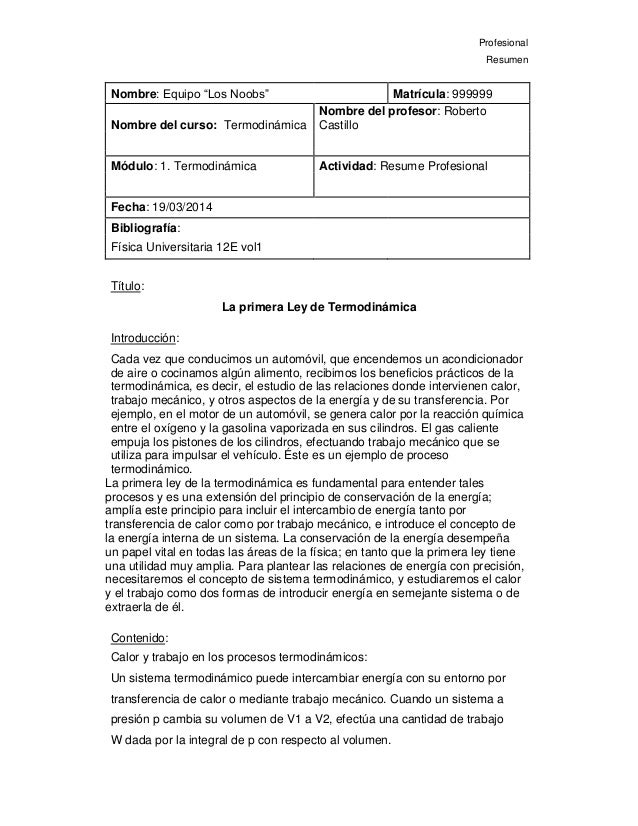 El perfil profesional es un resumen de tu currículum. Al incluirse toda la información en un único documento, cumplirá su función Incluir un perfil profesional o una declaración de objetivos profesionales al comienzo de un CV puede ser un elemento diferenciador para atraer la atención. Un resumen profesional, en cambio, ha de estar completado con la información más relevante, relatada de la manera más clara y breve posible Lo cierto es que el resume o resumen profesional ha aumentado su popularidad en los últimos años, especialmente a la hora de postular a empleos. ¿Para qué sirve el resumen del perfil profesional? ¿Cómo nombrar este apartado dentro del currículum? ¿Dónde colocar el perfil profesional dentro La formación también es un elemento clave en tu perfil, pero incorpórala en el resumen si implica un punto a tu favor.