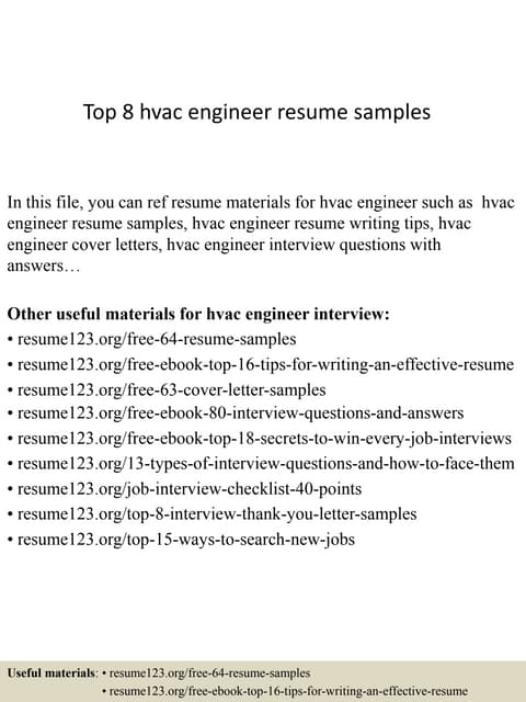 Hvac Engineer Resume Samples and examples of curated bullet points for your resume to help you get an Under the guidance of a more senior engineer, conduct on and off site evaluation of products to Hvac Engineer Resume Examples & Samples.